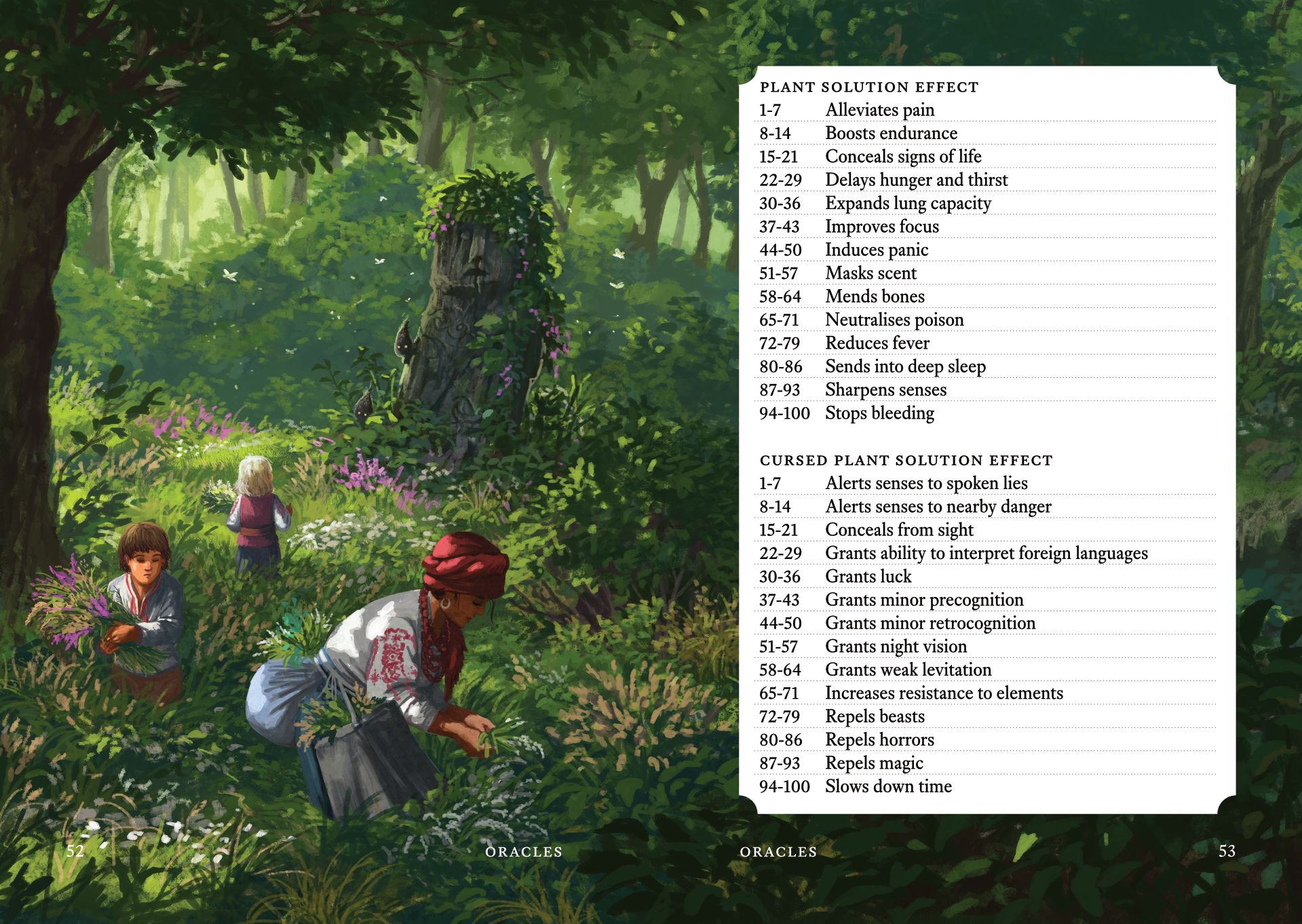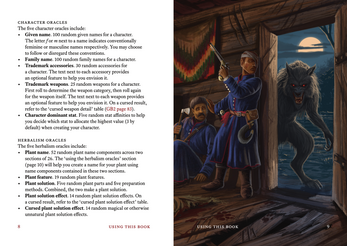 - narrative-forward implementation of herbalism, complete with oracle tables for plant name generation, plant features, herbal remedy effects and more